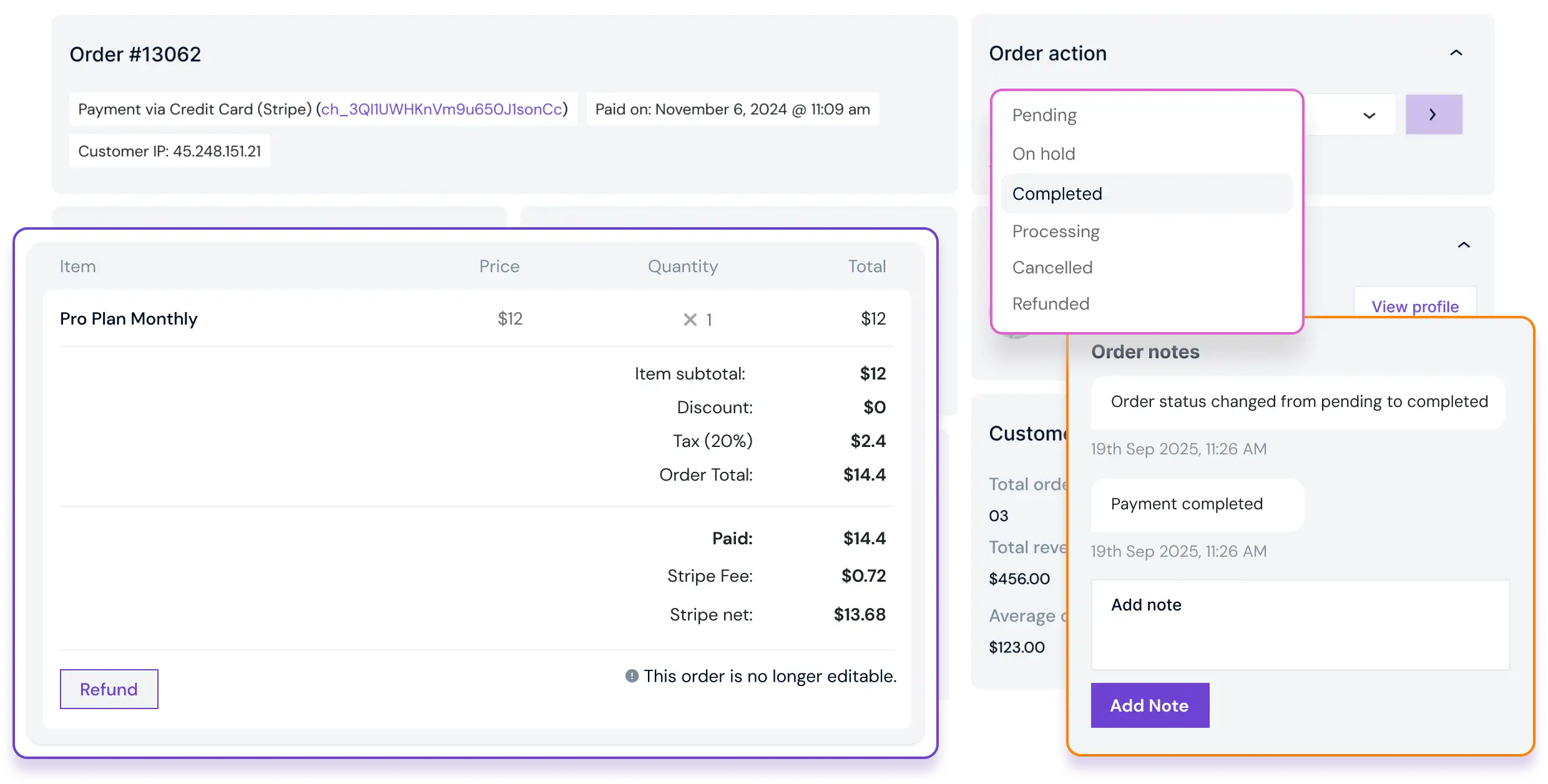 Yes. You can process refunds, track pending or failed payments, and update order status, all from your dashboard.